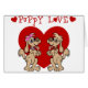 2 mignons chiens chiots debout devant un grand coeur rouge et le terme Puppy Love est disponible sur les t-shirts, autocollants, sacs fourre-tout, cartes de voeux, porte - clés, tasses à café et plus encore.