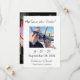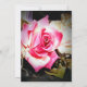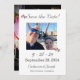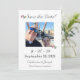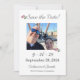 Design avant présente votre photo juste en dessous de l'en-tête, "Save the Date!" dans une police élégante de couleur argent. L'image de deux roses entrelacés est photographiée à côté du titre. La même image est affichée en bas, à droite de la photo. La date du mariage est clairement affichée ci-dessous dans deux styles différents. Ville et état du mariage apparaît en plus petit texte au bas de la conception. Le design du dos est une image arrière - plan d'une rose rose en fleurs. Conçu pour coordonner avec la "Love is in Bloom Mariage Suite".