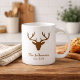 Die Tasse ist hübsch im Landhaus eingerichtet und bietet eine braune Silhouette mit Hirschkopf. Darunter befindet sich eine Vorlage für Ihren Familiennamen und eine weitere für das Datum, an dem sie eingerichtet wurde. Clipart: Artwork created by: AMBillustrations http://www.etsy.com/shop/AMBillustrations/