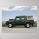 Green Land Rover Defender 110 mit Feld und Bergen im Hintergrund.