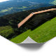 Posterprint einer Landschaft mit zwei Holzhäusern in einer grünen Weide mit Blick auf das Lauterbrunnen Tal, umgeben von hohen Alpen, im Sommer aus Wengen, Berner Oberland, Kanton Bern, in der Schweiz.