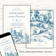 "Countryside Toile de Jouy" Einladung Hochzeitsfeiern Diese besondere Hochzeitseinladung zeichne Inspiration aus der romantischen französischen Toile de Jouy und zeigt eine herrliche Landschaft. Toile de Jouy ist eine klassische Vintage Wahl, die jeder Hochzeit eine elegante Touch verleiht. Ideal für Hochzeiten auf dem Lande, für Hochzeiten im Shabby Chic, für rustikale Hochzeiten, Hochzeiten im Freien oder auch für Hochzeiten in den Bergen. Dieses Vorlagenprodukt ist in gedruckter Form und auch als elektronische Einladung zum sofortigen Download erhältlich. Die Formulierung ist vollständig editierbar. Sie können Größe, Farbe, Schriftart, Position ändern.