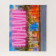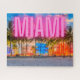 Das wunderschöne und farbenfrohe Puzzle bietet einen fotografischen Blick auf neonbeleuchtete Miami-Gebäude mit Palmen, blauen bewölkten Himmel und große neonrosa MIAMI-Textüberlagerung