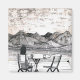 Gesichter in der Landschaft. Beziehungen mit allen werden von diesem Mann in der Wüste in Betracht gezogen. In der Ferne sieht man eine seltsame Stelle, Gesichter in den Wolken und Bergen sehr deutlich. Eine Person sitzt in einem Stuhl an einem Tisch. Vor dem Sitzplatz gibt es ein Getränk und vor einem nicht besetzten Stuhl ein Getränk. Die Person, die wir von hinten sehen, blickt in die vielen Gesichter in den Bergen und Wolken in dieser schwarzen, weißen, grauen und etwas sepia handgezeichneten Abbildung. Entworfen von Lee Serenethos, Gezeichnet von John Wampler. 1_faces_in_lands_OPJ300sRGB© Copyright 2010 Lee Serenethos