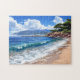Landschaftliche Küstenlandschaft: Strand, Wellen und Berge im Hintergrund.