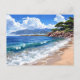 Landschaftliche Küstenlandschaft: Strand, Wellen und Berge im Hintergrund.