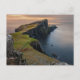 Eine coole, ruhige Landschaft an der Küste Schottlands. Schönes und landschaftliches schottisches Gelände. Mossy grüne Hügel und Felsen. Ein ruhiges Meer unterhalb. Ein goldener Sonnenuntergang in der Ferne.