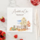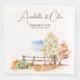 Diese rustikalen und romantischen, im Herbst inspirierten Hochzeitsnapkins zeichnen sich durch ein Aquarellbild aus, das eine Herbstlandschaft darstellt. Bäume mit goldenen Herbstfarben in Gelb und Orange bilden ein Dach über einem Holzzaun. Drei Kürbis und ein Äpfelkorb stehen vor dem Zaun auf einem Haufen Blätter.