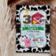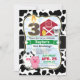 Niedliche Junge oder Mädchen rot, schwarz, weiß, rosa, gelb, braun, grün, kuh, schwein, gelb Küken, Huhn, Schaffarm Thema Geburtstag Einladung auf Schwarz-Weiß-Cowhid Muster Hintergrund. Personalisieren Sie dieses niedliche, laden Sie mit dem Namen Ihres Kindes ein. Enthält eine 3., 3. Geburtstagskandle, die auf das Alter Ihres Kindes personalisiert sein kann. Ideal für Kinder, die das erste, das erste, das erste, das erste, das erste, das erste, das zweite, das Kleinkind, die kleinen Kinder oder die älteren Kinder. Große Einladung für Bauernhof, Bauer, Landhaus Tier Geburtstagsparty.
