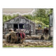 Ein ungewöhnliches abstraktes Design der Farm mit Scheunen, Kühen, Pferd und Ausrüstung.