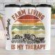 Das ist ein rustikales Grafikdesign mit einem Bauernthema. Das zentrale Bild zeigt einen klassischen Traktor, der einen Anhänger zieht, und eine traditionelle Scheune mit einer Windmühle. Die Szene ist Set in einem gepflügten Feld vor einem Sonnenuntergang mit einer strahlenden Sonne und Wolken. Die Ausdrücke "FARM LIVING" und "IS MY THERAPY" werden in einem kühlen, verwitterten Schriftart prominent über und unter der Szene dargestellt. Das Design ist unten durch einen Zaun mit dekorativen Weizenbündel eingeschlossen.
