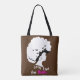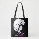 Profilbild eines weiblichen mit vollblühtem kinky Afro auf einem großen Totbeutel; schwarzer Hintergrund auf einer Seite, brauner Hintergrund auf der anderen Seite.