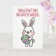 Diese Karte zeigt eine einfache digitale Illustration einer weißen, langohrigen, hasenähnlichen Figur 🐰, die aufrecht vor einem schlichten weißen Hintergrund steht. Sie hat winzige schwarze Punkte als Augen, runde rosige Wangen und ein offenes Lächeln mit herausgestreckter Zunge, was ihr einen süßen, freundlichen Ausdruck verleiht, der so wirkt, als sei er für jemanden bestimmt, der einem nahesteht. Die Figur umarmt sanft ein ovalförmiges Ei, als würde sie ein kleines Geschenk für einen Freund oder jemanden, den sie sehr mag, umarmen. Das Ei ist mit fließenden, wellenförmigen Bändern in Pastellblau, zartem Rosa und sonnigem Gelb verziert, was einen Frühlingshauch 🌷 hinzufügt. Oben befindet sich in der Nähe eine kurze Nachricht über der Figur in abgerundeten Blasenbuchstaben, die in leuchtendem Rosa gefärbt sind. Der
