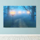 Quatre lampes brillantes sur quatre lampadaires brillent à travers un brouillard dense, illuminant un chemin sinueux à travers les ombres et des banches nues d'arbres d'hiver.
