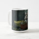 Cette tasse montre un lapin de Pâques brun et blanc foncé dans les bois avec un panier de surprises.