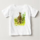 Voici un adorable t-shirt bébé avec un mignon lapin brun dans l'herbe verte.