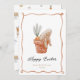 Célébrez Pâques avec cette charmante carte de voeux illustrant de façon fantaisiste un lapin reposant dans un pot à fleurs à pois de polka avec carotte et verdure. Le design d'aquarelle douce et les bords de pétoncles ajoutent une touche d'élégance et de jeu, ce qui le rend parfait pour envoyer des souhaits de vacances chaleureux à la famille et à des amis.