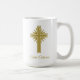 Shown is a lovely Christian large mug featuring a shining gold cross and personalized golden script text. This religious mug would make a wonderful gift for your favorite Christian, Catholic, CCD school or religious school teacher; nun, priest, pastor, spiritual friend or faithful relative. This personalized golden cross design can be ordered on a variety of mug styles and sizes, as well as on travel mugs and other gifts. The text is fully editable, including color, style, size, and placement, or it can be deleted. From Called. #TeacherGiftReligious #ReligiousMug #PersonalizedReligiousGift #LargeReligiousMug