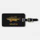 This is a double-sided luggage tag. Front: A largemouth bass is on a black background. A line of text is under the fish. You can edit the text to show your name.