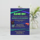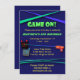 Eine lustige Laser Tag Einladung, die heißt Game On! Neonfarben, Laserstrahlen, Phaserpistole und Westen werden dargestellt. Personalisieren Sie diese Einladung für die Geburtstagsparty eines Kindes. Es funktioniert auch für das Gebäude von Firmenteams.