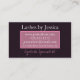 Das elegante Design der Visitenkarte für Ihr Spezialitätenunternehmen. Handgeschriebene Schrifttyp überlagerte sich auf einem doppelrosa Rahmen mit einem Hintergrund aus Glitzer mit blütigem Rose. Die folgende zusätzliche Zeile für Ihren Titel oder Firmennamen. Mehrere Zeilen auf der Rückseite, um mit all Ihren Kontaktdaten zu personalisieren. Ein schönes, aber schlichtes Design in Rosa und Schwarz, das beruflich und modern aussieht.