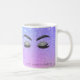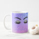 Moderne gürtelförmige Tasse mit braunem Salonkaffee mit wunderschönen Makeup-Augen und Brauen über einem holografischen ombre-Farbverlauf lila lila, und lila Lavendel Glitzer glitzernden Hintergrund. +++++++++++++++++++ Persönlich mit dem lila Salonnamen der Techniker und Pastelle.