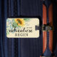 Lass des Abenteuers beginnt mit Aquarellsonnenblume Eukalyptusgrün auf gelben Gepäckanhänger mit personalisierten Infos.