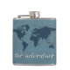 Lass dem Abenteuer Textdesign mit World Map Dekoration auf grunge, blauem Hintergrund