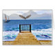 Kunstmalerei eines Ozeans mit Bergen und Segelbooten mit und Adler fliegen vorbei. Ein Spazierweg, auf dem man Uhr stehen kann, träumen möchte und Sorgen lasse.