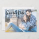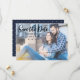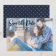 Horizontale Save the Date Karte. Dieses Design hat ein lässiges Aussehen und Gefühl. Auf der Rückseite ist ein dunkelblauer Hintergrund mit goldfarbenen Punkten.