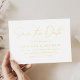 Einfache Save the Date Karte mit "Save the Date" in einem handgeschriebenen Goldfolienskript mit weißem Hintergrund. Personalisieren Sie die moderne Save the Date-Karte, indem Sie Ihre Namen, das Hochzeitsdatum, den Hochzeitsort, die Hochzeitswebsite, etc. hinzufügen. Die minimalistisch Save the Date Karte kehrt um, um einen soliden schwarzen Hintergrund oder eine Farbe Ihrer Wahl anzuzeigen.