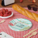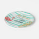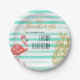Erleben Sie ein tropisches Ambiente mit diesem wunderschönen Flamingo in Aquarell mit Minzstreifen-Brautparty-Tellern mit "Let's Flamingle" im vergoldeten Glitzer.
