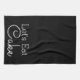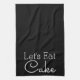Modernes, schwarzes Küchentuch mit den Worten "Lasst uns Kuchen essen" in weißer Schrift.