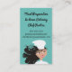 Niedliche moderne schwarz-haarige Frau, die den Hut und die Jacke eines Koch, laufend mit einem Haubenservierplatten- oder -nahrungsmittelteller auf dieser Geschäftskarte für persönlichen oder privaten Koch, Lebensmittellieferanten oder Catering, Mahlzeitlieferung, kochende Klassen oder anderes Nahrung- oder kulinarischesgeschäft trägt.