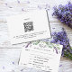 Un arrière - plan blanc, du texte noir. Décoré de fleurs de lavande et de verdure d'eucalyptus. Personnalisez et ajoutez la réponse par date et par sélection de menu. Dos : Violet couleur arrière - plan. Ajoutez votre URL à votre site web mariage pour rsvp et/ou plus de détails.