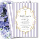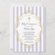 Erste heilige Kommunion Einladung mit lavender & white stripe Hintergrund mit einem goldenen Kreuz & Rahmen für eine Mädchengemeinde.