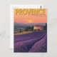 Diese schöne Karte zeigt eine Vintage Abbildung der rollenden Lavendelfelder der Provence, Frankreich, bei Sonnenuntergang. Das Design vereint ein klassisches Gebäude aus Stein, eingebettet in die lebhaften lila Reihen mit Zypressen und Hügeln im Hintergrund. Das warme, goldene Stundenlicht und die Retro-Typografie verleihen ihm das Gefühl eines zeitlosen Reiseplakats. Es ist die perfekte Karte für eine Notiz von Ihren Reisen oder ein Geschenk für einen Natur- und Kunstliebhaber.