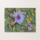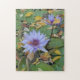 Schöne Blume der Wasserlilie in voller Blüte auf Lilienplanken im Wasser. Die Blütenblätter der Blume sind leicht lila mit dunkleren Mittelpunkten. Einige Herbstblätter fallen unter die Lilienpads. Naturfotografie. Das Bild vermittelt die Blüten und ihre Widerstandskraft, inmitten des kommenden kälteren Wetters und der zerfallenden Pflanze, über die gesprungen wird. Wählen Sie aus verschiedenen Schwierigkeitsgraden.