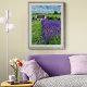 Vibrant lavender field in full bloom, showcasing a picturesque English countryside scene. A quaint white cottage nestles amidst rolling green fields and purple flowers. This tranquil rural landscape captures the essence of a summer farmhouse setting, ideal for nature photography and scenic views.
