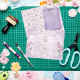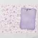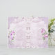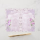 Lavendel violette Blumen auf beiden Seiten mit grafischen Spitzen-Ecken, ländlicher Chic-Stil, Junk Journal-Seiten mit Lavendelnoteletten auf der rechten Seite auf der Rückseite. Kleiner Lavendel mit Blumenmuster-Hintergrund vorne und hinten.