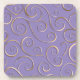 This is a Lavender Gold Swirl plastic coaster set. This coaster has a lavender background with faux gold foil swirls. The swirls curve outwards. The coaster is a hard plastic coaster with a cork backing. There are six coasters in the set.
