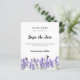 Ein modernes und elegantes Save the Date für eine Hochzeit. Weißer Hintergrund mit Aquarelllavender-Blume. Personalisieren und fügen Sie ein Datum und Ihre Namen. Der Text: Save the Date ist mit einem großen angesagten, handgeschriebenen Stilskript geschrieben. Zurück: Lavendelhintergrund. 1 Blatt = 1 Einladung mit Druckkante bis Kante.