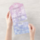 Dieses Design besticht durch einen modernen, weichen pastellfarbenen Lavendel, rosa und blau-braunen Hintergrund. Modern und einfach. Personalisierte All-In-One-Einladungen sind eine einzigartige Kombination aus einer schön gedruckten, maßgeschneiderten Einladung und einer leicht zu abreißenden perforierten UAWG-Postkarte. Und sie sind so einfach zu bedienen! Man falte einfach, dann Siegel die Rückklappe mit den drei beiliegenden Klarkleben, und Post. Und wenn Ihre Gäste Ihre persönliche Einladung erhalten, reißen sie einfach die perforierte RSVP Karte ab und lassen sie in der Mail an Sie zurück!