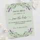 Une carte Save the Date moderne et élégante pour un mariage. Un arrière - plan vert sage décoré de fleurs de lavande et de verdure d'eucalyptus. Personnalisez et ajoutez une date et vos noms. Le texte : Save the Date est écrit avec un grand script de style à la main tendance. Retour : arrière - plan vert sage