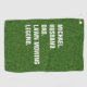 A bold Lawn Mowing Legend golf towel featuring clean white typography set against a realistic grass-textured background.