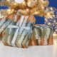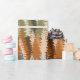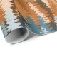 An illustration of layered pine trees arranged in horizontal bands, featuring cool blue, khaki, and orange shades.