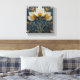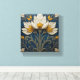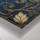 White and yellow flowers with golden tinged green leaves on a blue background, intricate floral patterns, ornate frame, elegant design, symmetrical composition, vintage style, decorative art.