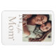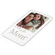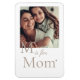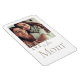 Weißer Hintergrundmagnet mit einem fett gedruckten Serifenbrief in der Nähe eines zentrierten Fotos. Unten steht ein Skriptsatz mit "is for", gefolgt vom Serifenwort "Mama" und einem kleinen Herz. Ein weiches Layout, das Bilder mit sinnvoller Typografie kombiniert.