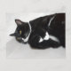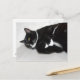 Postkarte mit niedlicher schwarz-weißer Tuxedokatze auf dem Tisch