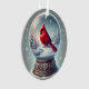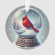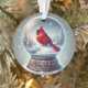 Un cardinal rouge vif perché dans un globe enneigé orné, entouré d'un paysage hivernal glacé avec des arbres enneigés et des flocons de neige délicats.